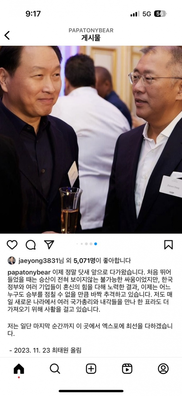 2030 ¼¼°è¹Ú¶÷ȸ(¿ùµå¿¢½ºÆ÷) ºÎ»ê ¹Î°£À¯Ä¡À§¿øÀåÀ» ¸Ã°í ÀÖ´Â ÃÖÅ¿ø ´ëÇÑ»óÀÇ È¸ÀåÀº 23ÀÏ ÀÚ½ÅÀÇ ÀνºÅ¸±×·¥ °èÁ¤¿¡ ¡°¡°Ã³À½ ¶Ù...