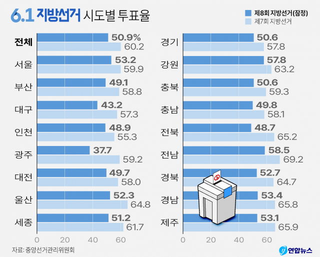 6¡¤1 Áö¹æ¼±°Å ÅõÇ¥À²ÀÌ 50%¸¦ °£½ÅÈ÷ ³Ñ¾î¼¸é¼ ¿ª´ë 8¹øÀÇ Áö¹æ¼±°Å °¡¿îµ¥ µÎ ¹øÂ°·Î ³·Àº ÅõÇ¥À²À» º¸¿´´Ù.Áß¾Ó¼±°Å°ü¸®À§¿øÈ¸°¡ Áý°èÇÑ ÅõÇ¥À²Àº 50.9%·Î ÀáÁ¤ Áý°èµÆ´Ù. Àüü À¯±ÇÀÚ 4430¸¸ 3449¸í °¡...