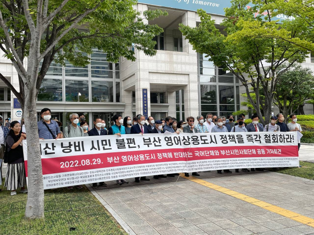 ºÎ»êÀÇ 34°³ ½Ã¹Î»çȸ´Üü¿Í Àü±¹ 76°³ ±¹¾î´Üü°¡ Âü¿©ÇÏ´Â ¡®ºÎ»ê ¿µ¾î»ó¿ëµµ½Ã Á¤Ã¥ ¹Ý´ë ±¹¹Î¿¬ÇÕ¡¯ÀÌ 29ÀÏ ºÎ»ê½Ãû ¾Õ¿¡¼ °øµ¿...