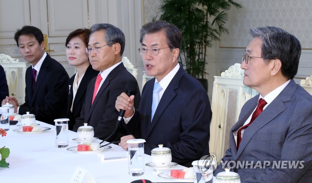 ¹® ´ëÅë·É, '4°´ë»çµé°ú'(¼¿ï=¿¬ÇÕ´º½º) ¹èÀ縸 ±âÀÚ = ¹®ÀçÀÎ ´ëÅë·ÉÀÌ 25ÀÏ ¿ÀÀü û¿Í´ë¿¡¼ 4° ´ë»ç¿¡°Ô ½ÅÀÓÀåÀ» ¼ö¿©ÇÑ µÚ Â÷´ãȸ¸¦ ¿°í ¾ê±â¸¦ ³ª´©°í ÀÖ´Ù. scoop@yna.co.kr Ùþ´ëÅë·É "4° ¿Ü±³...