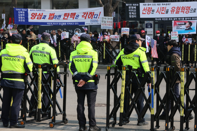 10ÀÏ ¼¿ï Á¾·Î±¸ Çå¹ýÀçÆÇ¼Ò ¾Õ¿¡¼ °æÂûµéÀÌ ±Ù¹«¸¦ ¼°í ÀÖ´Ù. À̸£¸é À̹ø ÁÖ À±¼®¿ ´ëÅë·É¿¡ ´ëÇÑ ÅºÇÙ½ÉÆÇ ¼±°í°¡ ...