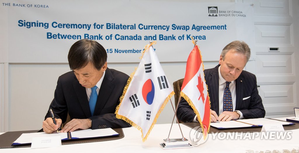 Çѱ¹-ij³ª´Ù ÅëȽº¿ÍÇÁ »ó¼³°è¾à ü°á(¼¿ï=¿¬ÇÕ´º½º) ÀÌÁÖ¿ Çѱ¹ÀºÇà ÃÑÀç(¿ÞÂÊ)°¡ 15ÀÏ ¿ÀÈÄ(ÇöÁö ½Ã°£) ij³ª´Ù ¿ÀŸ¿Í¿¡ À§Ä¡ÇÑ Ä³³ª´ÙÁß¾ÓÀºÇà º»ºÎ¿¡¼ ½ºÆ¼ºì Æú·ÎÁî ij³ª´ÙÁß¾ÓÀºÇà ÃÑÀç¿Í ¾ç±¹°£ ÅëÈ...