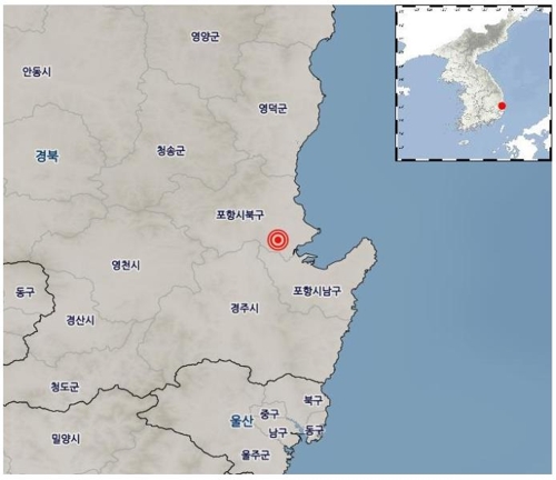 6ÀÏ ¿ÀÀü ¹ß»ýÇÑ Æ÷Ç× ÁöÁø À§Ä¡[±â»óû Á¦°ø=¿¬ÇÕ´º½º] (¼¿ï=¿¬ÇÕ´º½º) ¼º¼È£ ±âÀÚ = 6ÀÏ ¿ÀÀü 9½Ã 18ºÐ 33ÃÊ °æºÏ Æ÷Ç׽à ºÏ±¸ ºÏ¼ÂÊ 5§° Áö¿ª¿¡¼ ±Ô¸ð 2.5ÀÇ ÁöÁøÀÌ ¹ß»ýÇß´Ù°í ±â»óûÀÌ ¹àÇû´Ù...