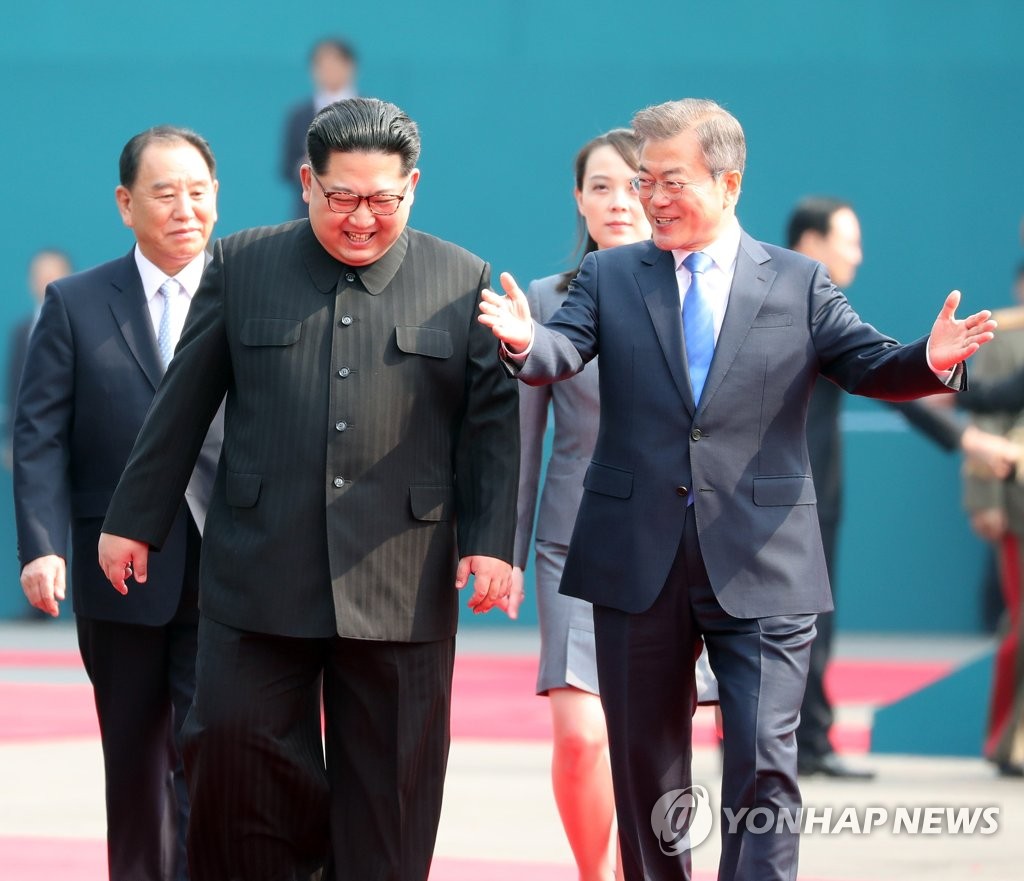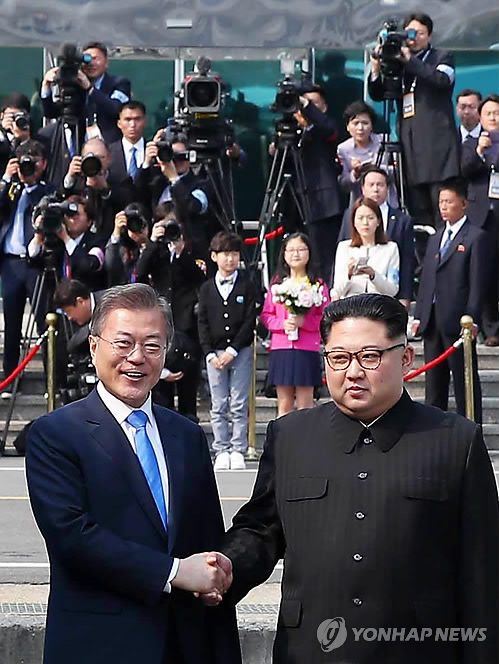 [³²ºÏÁ¤»óȸ´ã] ¼Õ ¸¶ÁÖ ÀâÀº ³²ºÏÁ¤»ó(ÆÇ¹®Á¡=¿¬ÇÕ´º½º] Ȳ±¤¸ð ±âÀÚ = ¹®ÀçÀÎ ´ëÅë·ÉÀÌ 27ÀÏ ¿ÀÀü ÆÇ¹®Á¡¿¡¼ ±º»çºÐ°è¼±À» ³ÑÀº ºÏÇÑ ±èÁ¤Àº ±¹¹«À§¿øÀå°ú ¾Ç¼öÇÏ¸ç ±â³äÃÔ¿µÀ» Çϰí ÀÖ´Ù. 2018.4.27 hk...