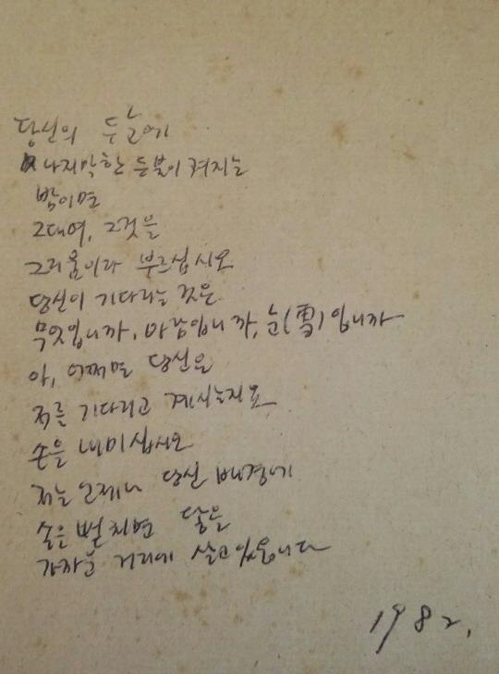¾È¾ç ¹æÀ§º´ ½ÃÀý ¹®ÇÐȸ Ȱµ¿ÇÏ¸ç ¾´ ÀÛǰ °ø°³ [¹ÚÀοÁ ½ÃÀÎ Á¦°ø] (¼¿ï) ±è°è¿¬ ±âÀÚ = "´ç½ÅÀÇ µÎ ´«¿¡/ ³ªÁö¸·ÇÑ µîºÒÀÌ ÄÑÁö´Â/ ¹ãÀ̸é/ ±×´ë¿©, ±×°ÍÀº/ ±×¸®¿òÀ̶ó ºÎ¸£½Ê½Ã¿À/ ´ç½ÅÀÌ ±â´Ù...