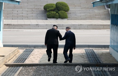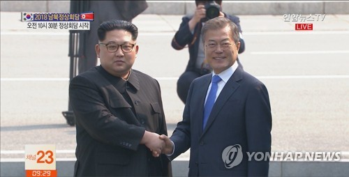 [³²ºÏÁ¤»óȸ´ã] ¼Õ ¸¶ÁÖ ÀâÀº ³²ºÏÁ¤»ó(ÆÇ¹®Á¡=¿¬ÇÕ´º½º] Ȳ±¤¸ð ±âÀÚ = ¹®ÀçÀÎ ´ëÅë·ÉÀÌ 27ÀÏ ¿ÀÀü ÆÇ¹®Á¡¿¡¼ ±º»çºÐ°è¼±À» ³ÑÀº ºÏÇÑ ±èÁ¤Àº ±¹¹«À§¿øÀå°ú ¾Ç¼öÇÏ¸ç ±â³äÃÔ¿µÀ» Çϰí ÀÖ´Ù. 2018.4.27 hk...