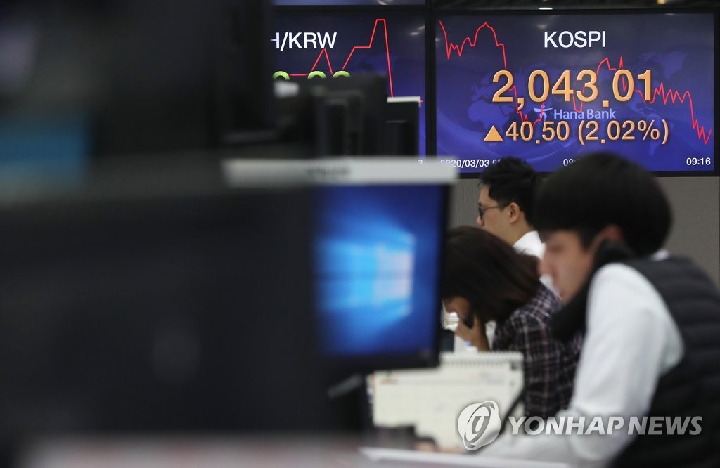 ÄÚ½ºÇÇ 2% ¿À¸¥Ã¤ Ãâ¹ß (¼¿ï=¿¬ÇÕ´º½º) ½ÅÁØÈñ ±âÀÚ = ÄÚ½ºÇǰ¡ 2%´ë ±Þµî¼¼·Î Ãâ¹ßÇÑ 3ÀÏ ¸íµ¿ ÇϳªÀºÇà º»Á¡ µô¸µ·ë Àü±¤ÆÇ¿¡ Áö¼ö°¡ Ç¥½ÃµÅ ÀÖ´Ù. 2020.3.3 hama@yna.co.kr (¼¿ï=¿¬ÇÕ´º½º) ±è¾Æ¶÷ ±â...