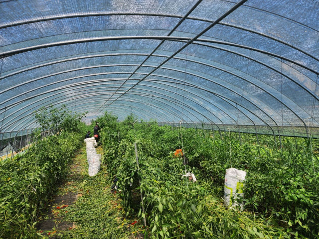 40µµ°¡ ³Ñ´Â ºñ´ÒÇϿ콺 ¾È¿¡¼ ³ó¹ÎµéÀÌ Æø¿°°ú »çÅõ¸¦ ¹úÀ̰í ÀÖ´Ù. °æ³² ¹Ð¾ç Çϳ²À¾ÀÇ ÇÑ ºñ´ÒÇϿ콺 °íÃß ¼öÈ® ÀÛ¾÷ ...