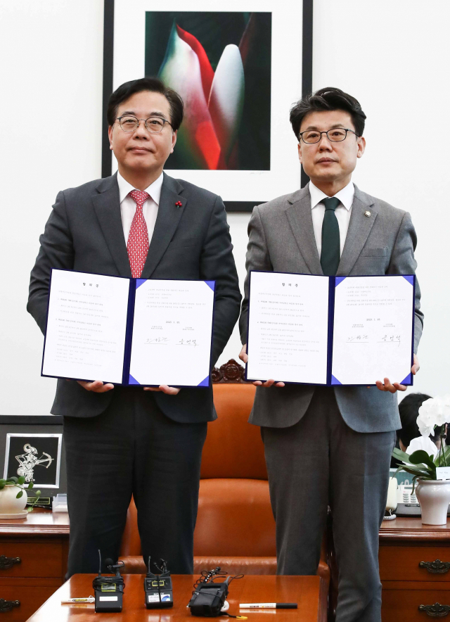 ±¹¹ÎÀÇÈû ¼Û¾ð¼® ¿ø³»¼ö¼®ºÎ´ëÇ¥(¿ÞÂÊ)¿Í ´õºÒ¾î¹ÎÁÖ´ç Áø¼ºÁØ ¿ø³»¼ö¼®ºÎ´ëÇ¥(¿À¸¥ÂÊ)°¡ 25ÀÏ ±¹È¸ ¿î¿µÀ§¿øÀå½Ç¿¡¼ 1, 2¿ù ÀÓ½Ãȸ ÀÇ»çÀÏÁ¤ ...