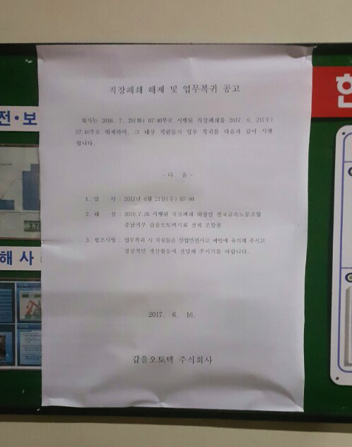 ³ë»ç "Á¶°Ç ¾øÀÌ Á÷ÀåÆó¼â ÇØÁö" ¾à¼Ó¡¦´ë»ó Á÷¿ø 21ÀϺÎÅÍ ¾÷¹« º¹±Í (¾Æ»ê) ±è¼Ò¿¬ ±âÀÚ = ±Ø½ÉÇÑ ³ë»ç ºÐ±Ô·Î ÁøÅëÀ» °Þ¾î ¿Â ÀÚµ¿Â÷ ºÎǰ¾÷ü °©À»¿ÀÅäÅØÀÇ Á÷ÀåÆó¼â°¡ 331ÀÏ ¸¸¿¡ ÇØÁ¦µÈ´Ù. 19ÀÏ °©À»¿ÀÅä...