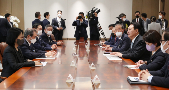 À±¼®¿ ´ëÅë·ÉÀÌ 4ÀÏ ¿ÀÈÄ ¼¿ï ¿ë»ê ´ëÅë·É½Ç û»ç¿¡¼ ÀϺ»ÀÇ ±â¾÷ÀÎ ´Üü °ÔÀÌ´Ü·»(ÌèÓ¥Ö§¡¤°æÁ¦´Üü¿¬ÇÕȸ) ´ëÇ¥´ÜÀ» Á¢°ßÇϰí ÀÖ´Ù.&n...